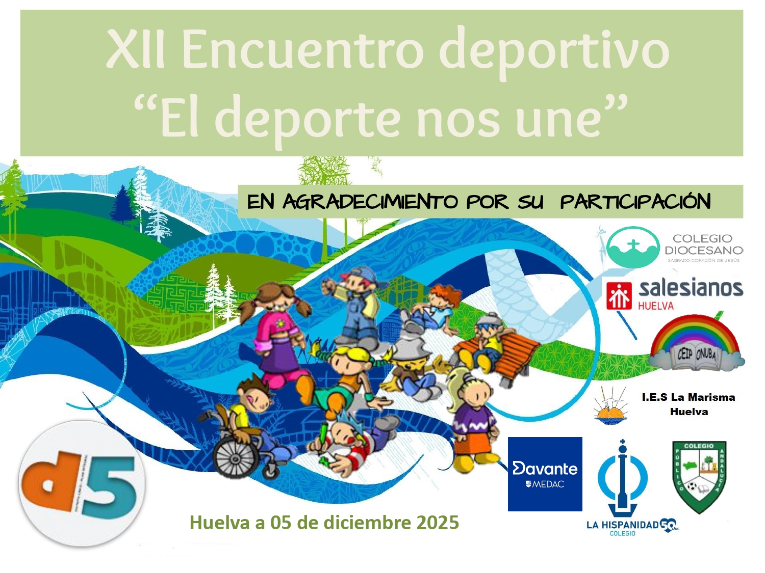 El Colegio de la Hispanidad ha participado ayer en la Actividad Deportiva Intercentro "El deporte nos une", organizada en el marco del Foro de Educación y Formación del Plan Integral del Distrito 5 de Huelva junto con el C.E.I.P "Andalucía", C.E.I.P "Onuba", Diocesano "Sagrado Corazón de Jesús", I.E.S "La Marisma" y Salesiano "Cristo Sacerdote".